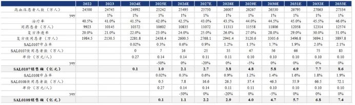 SAL0107 和 SAL0108 属于单片复方制剂,可以替代联合给药,提高患者依从性,主要用于单药治疗不佳的高血压患者,这两款药物将与阿利沙坦酯、S086 高血压适应症形成战略协同,满足各类高血压患者用药需求。华创证券预测,两款药物合计销售峰值为 16 亿元。