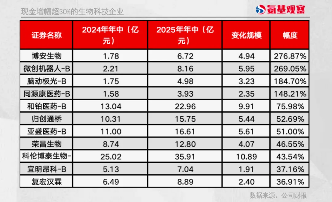 据氨基君统计,超30家生物科技企业现金总额回升,排除新上市公司,超10家企业涨幅超20%。其中,微创机器人、脑动极光、同源康医药表现尤为突出,现金储备较去年同期翻倍增长。
