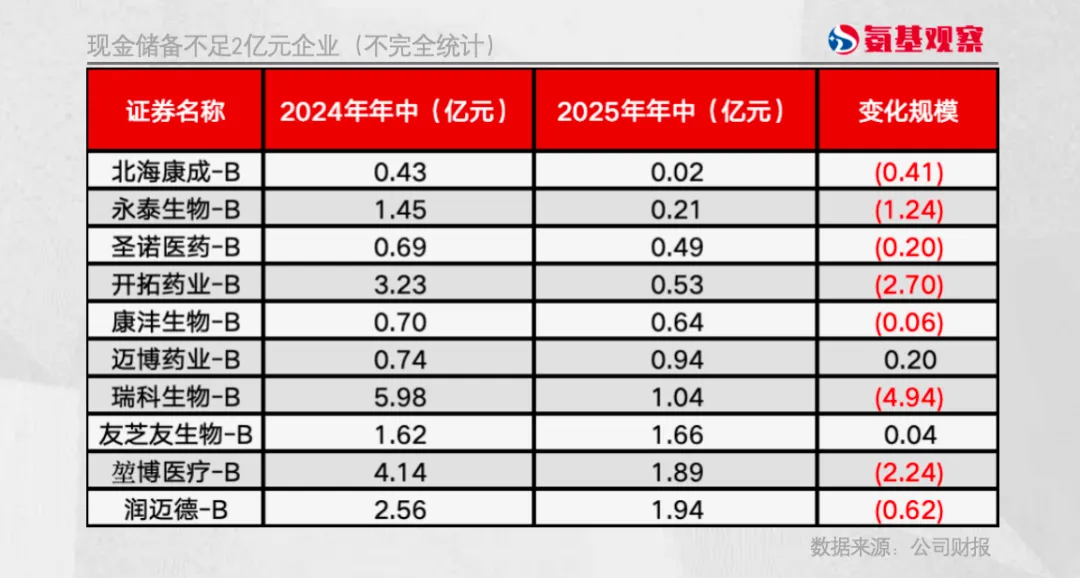 最极端的是北海康成。2025年中现金仅余196万元,一度濒临破产。其处境折射出行业残酷现实——若研发迟迟无法变现,只能眼睁睁看着现金耗尽。
