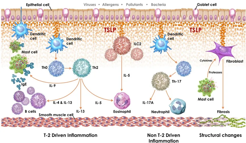 从生物学机制角度来看,TSLP在炎症信号通路中扮演着“枢纽开关”的关键角色,能够调控下游多种细胞因子的分泌,包括IL-4、IL-5、IL-13等关键炎症介质,形成一个复杂而精密的调控网络。这种“上游调控,一石多鸟”的机制特性,使得TSLP靶向治疗能够更全面地阻断炎症反应,并且具备在多种炎症性疾病中应用的广谱治疗潜力。