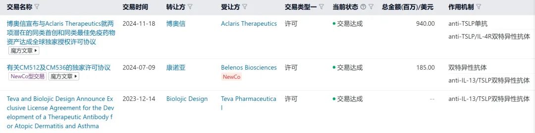 随后,TSLP赛道进入了交易密集期,2024年连续诞生了4笔交易[7-10]。今年初,和铂医药与科伦博泰合作开发的TSLP抗体又以近10亿美元的总交易额成功出海。这一系列交易的背后,反映的是全球市场对TSLP靶点商业价值的高度认可。