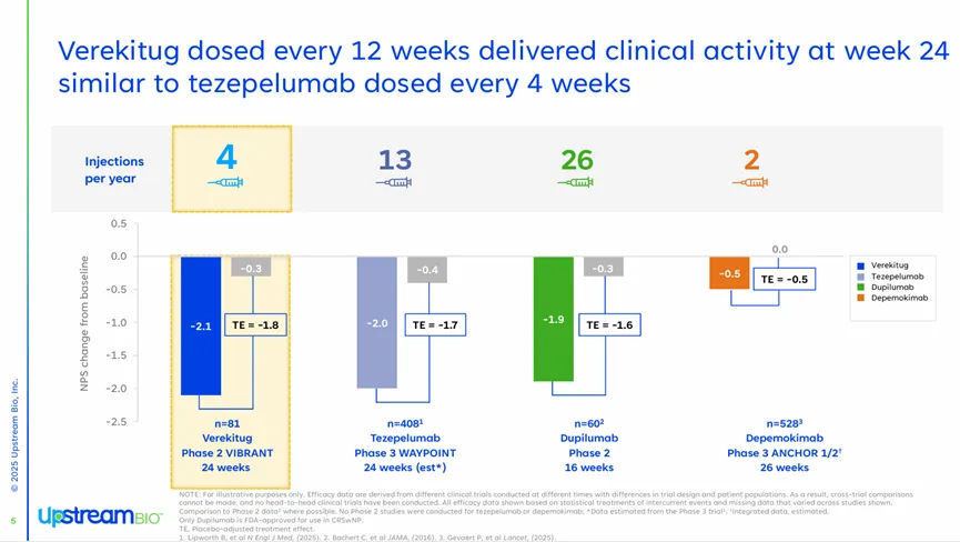 Verekitug在临床研究中的表现没有让投资者失望。在II期VIBRANT研究中,经Verekitug治疗24周后,CRSwNP患者的鼻息肉评分降低了2.1分,较安慰剂组降低了1.8分(P<0.0001)。重要的是,Verekitug能够在每12周1次的超长给药间隔下实现与现有生物制剂(每2周1次或每4周1次)相匹敌的疗效。这些强劲的数据充分证明了Verekitug独特的临床价值,曾经被战略放弃的“弃子”也在这一刻逆袭为赛道“黑马”。