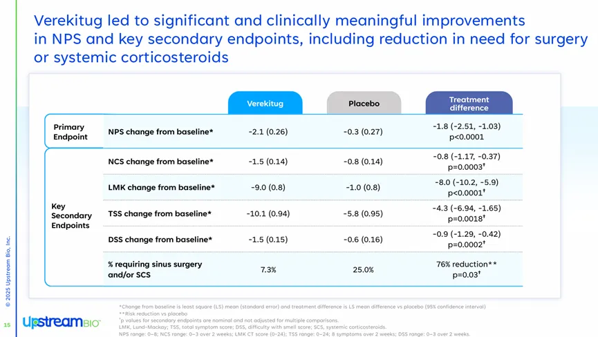除了在主要终点上的突出表现,Verekitug在多个关键次要终点上也实现了显著的变化,包括患者报告的鼻塞评分显著降低、鼻窦混浊程度减轻、嗅觉增强、全身性皮质类固醇或鼻息肉手术需求减少以及总症状评分(TSS)下降。