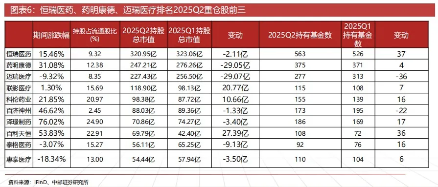从医药基金重仓排名看,恒瑞医药、药明康德、迈瑞医疗位列今年第二季度医药重仓股前三。