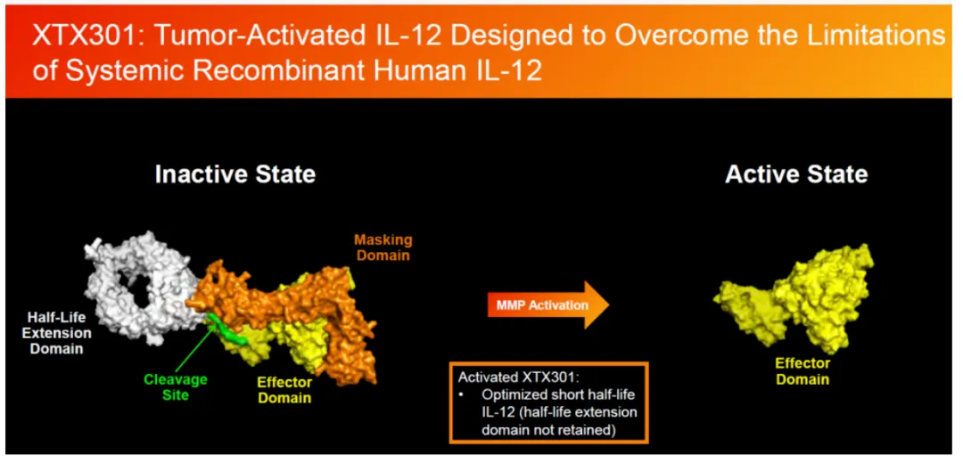 XTX301由IL-12异源二聚体、N端掩蔽多肽、蛋白酶敏感接头和半衰期延长结构域组成,在非活性状态下该分子静脉给药血浆半衰期可达14个小时,这时N端掩蔽多肽发挥作用利用空间位阻阻断IL-12在血液循环中与受体的结合;进入肿瘤微环境(TME)后,TME中失调活性的基质金属蛋白酶(MMP)切割蛋白酶敏感接头,并且遮蔽多肽和半衰期延长结构域一起脱落,活性IL-12半衰期缩短至<2 h,从而兼顾系统安全性与局部药效。