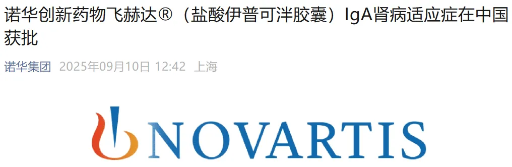 2025年9月10日,诺华制药(中国)宣布,其创新药物飞赫达®(盐酸伊普可泮胶囊)已获得中国国家药品监督管理局(NMPA)批准,用于治疗原发性免疫球蛋白A肾病(IgA肾病)。