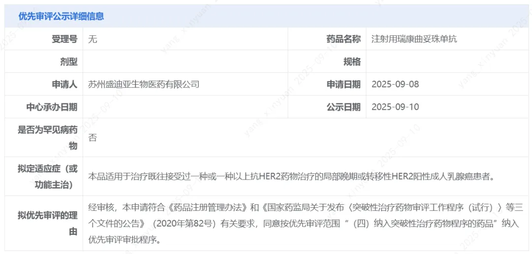 今日(9月10日),中国国家药监局药品审评中心(CDE)官网公示,恒瑞医药的1类新药注射用瑞康曲妥珠单抗拟纳入优先审评,适用于治疗既往接受过一种或一种以上抗HER2药物治疗的局部晚期或转移性HER2阳性成人乳腺癌患者。公开资料显示,瑞康曲妥珠单抗是一款HER2靶向抗体偶联药物(ADC),已经于今年5月在中国获批上市,用于非小细胞肺癌相关治疗。