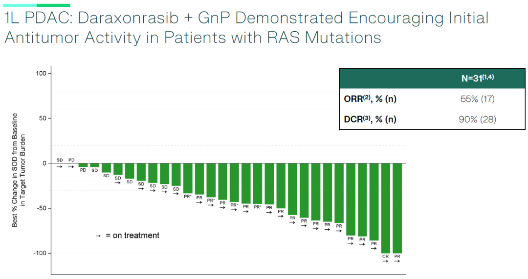 Daraxonrasib+GnP联合一线治疗胰腺癌的ORR为55%,DCR为90%。