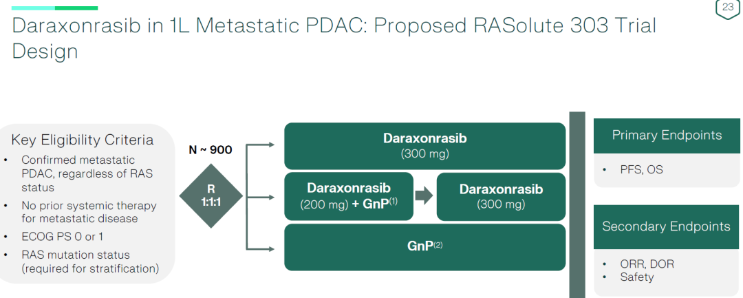 三期临床RASolute303计划入组900例一线胰腺癌患者,主要终点为PFS和OS。