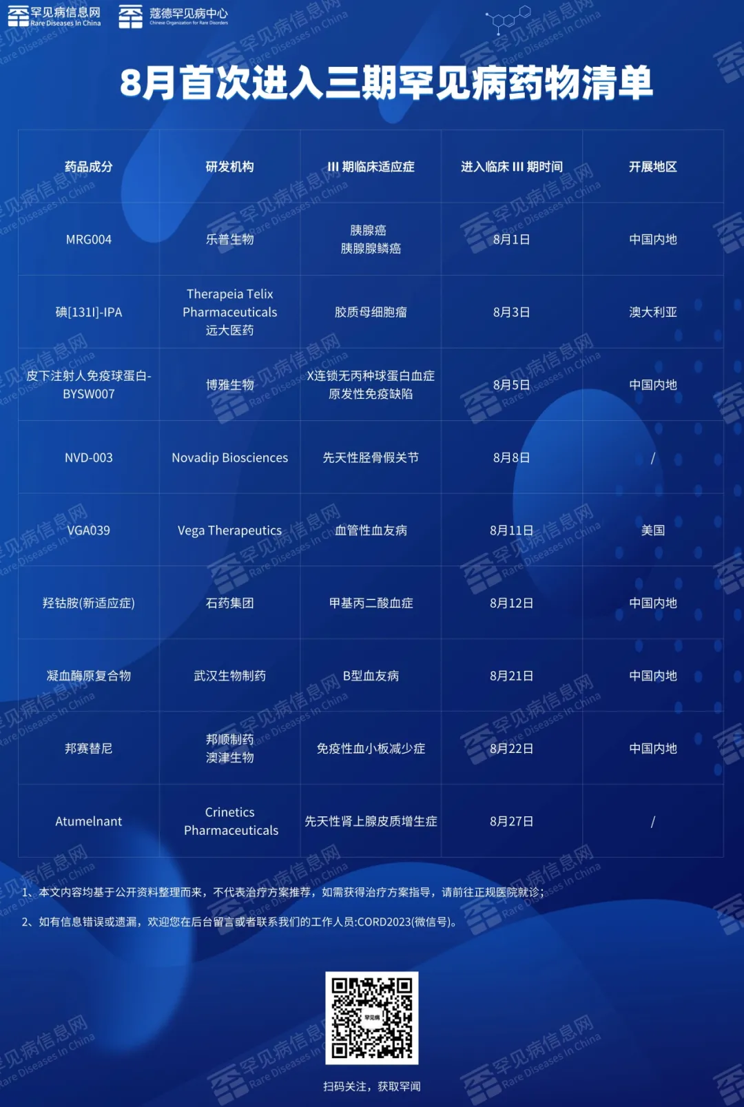 据罕见病信息网不完全统计,2025 年 8 月全球有9款罕见病药物首次进入临床三期阶段,涉及9种罕见病。例如,MRG004(已获FDA孤儿药资格认定),正针对胰腺癌开展临床三期试验;VGA039用于探索治疗血管性血友病的效果。更多药物进入临床三期,代表着它们向上市迈出关键一步,有望让更多罕见病患者获得有效治疗,为患者及其家庭带来新的希望。