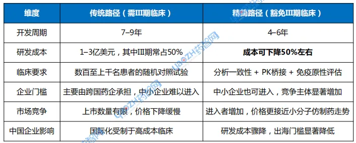 在传统路径下,开发一个单抗生物类似药往往需要七到九年,资金投入超过一亿至三亿美元,其中大规模的III期临床研究常常占到总预算的一半。很多企业在进入生物类似药开发时并非缺乏技术,而是被成本与周期劝退。豁免III期之后,开发周期有望缩短两到三年,研发费用下降50%,原本需要大规模现金流支撑的上市道路,突然变成了中型企业也能负担的项目。这一变化有望直接重塑行业格局。