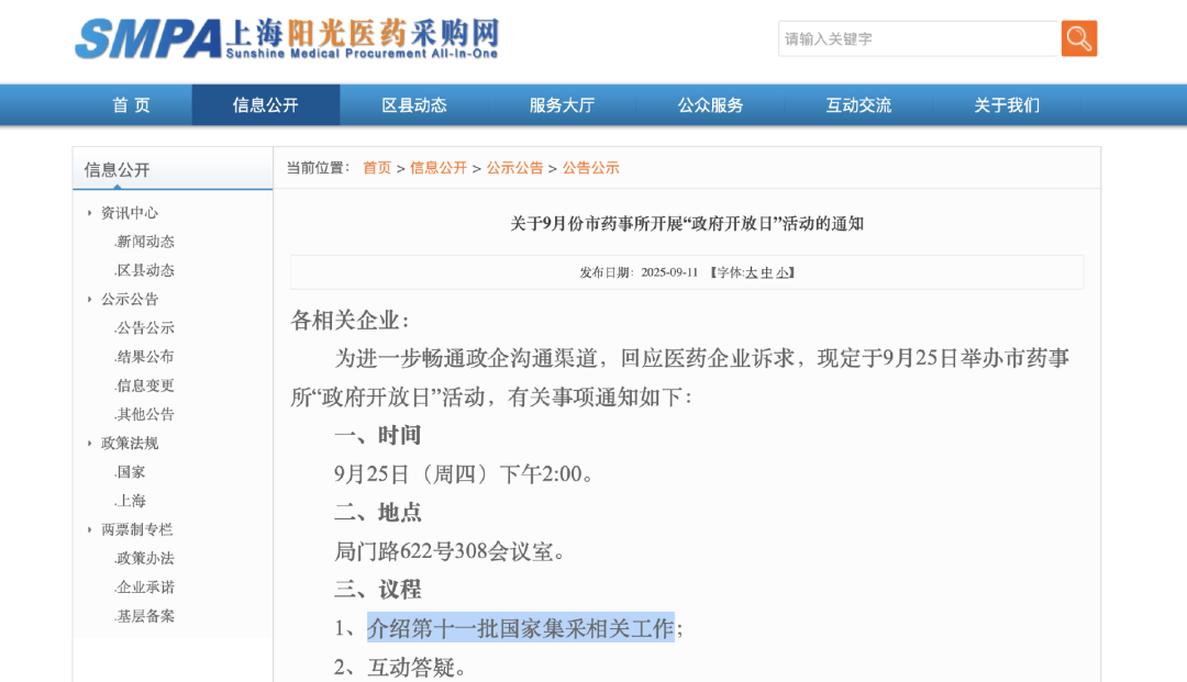 9月11日,上海市医药集中招标采购事务管理所发布通知,明确上海市药事所将于9月25日举办 “政府开放日” 活动,议程包括介绍第十一批国家集采相关工作,并开展互动答疑。