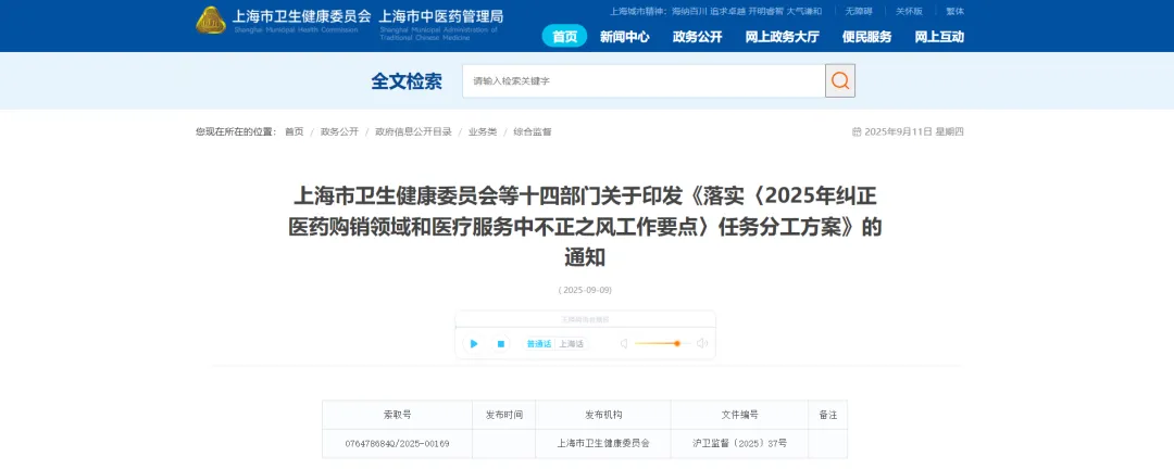 9月9日,上海市卫生健康委员会联合教育局、经济信息化委、公安分局等十四部门正式印发《落实〈2025年纠正医药购销领域和医疗服务中不正之风工作要点〉任务分工方案》(沪卫监督〔2025〕37号)。这一文件被视为2025年医药领域反腐工作的“升级版”,其覆盖范围之广、监管力度之深、执行措施之细,均创下历史新高。本文将从政策背景、核心举措、行业影响三个维度,深度解析这一方案对医药生态的重塑意义。