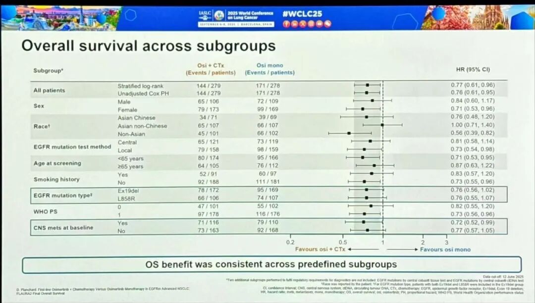 奥希替尼单药在创造了晚期EGFR敏感突变的非小细胞肺癌一线疗效新高度后,继续升级探索,通过与AC方案联合(4周期后奥希替尼+培美曲塞维持治疗)对比奥希替尼单药,III期FLAURA2在2023年已报道主要终点PFS的成功(25.5:16.7个月,HR=0.62),时隔2年后,最具临床意义的III期OS结果尘埃落定,以47.5:37.6个月,HR=0.77,P=0.02的绝对统计学优势和临床差异证明了靶化联合在EGFR敏感突变晚期肺癌一线的绝对地位,成就了新的一线标准。各亚组人群均呈获益趋势,且靶化联合组药物暴露分析显示化疗仅使用了较短的时间(中位暴露8.3个月)。该研究的成功一度引爆了与会现场的激烈讨论,也引发了对于晚期EGFR突变肺癌一线的方案(MARIPOSA研究埃万妥单抗联合拉泽替尼, OS HR=0.75(NEJM同步发文);AENESA2研究阿美替尼联合化疗,OS未成熟 初步HR=0.44 )对比讨论见标题3。