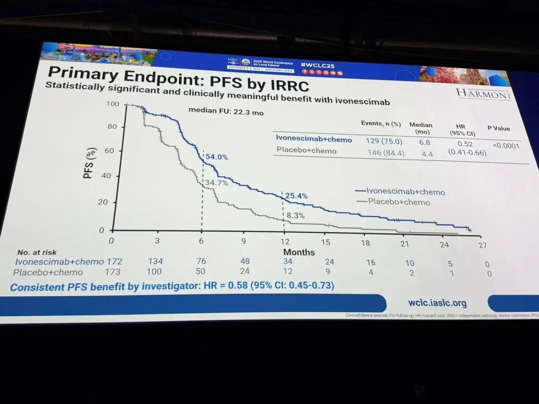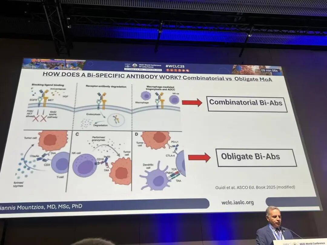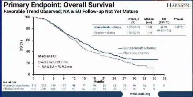 Ivonescimab是一款PD1/VEGFR双抗,联合化疗挑战EGFR突变肺癌靶向耐药后的二线治疗,结果显示,相比传统单纯化疗,主要终点PFS 6.8:4.4个月,HR=0.52,P<0.00001,获得阳性结果,另一联合终点OS亦有获益趋势(16.8:14.0个月,HR=0.79,P=0.057),为EGFR突变二线提出新的化疗加持模式,也引发了学者对于靶向耐药后二线新治疗方案(MARIPOSA-2研究:埃万妥单抗联合化疗;HERTHENA-Lung02研究:HER3 ADC药物Patritumab)以及免疫+化疗+抗血管三联方案的对比讨论。