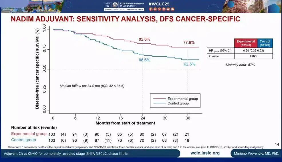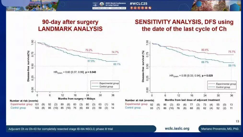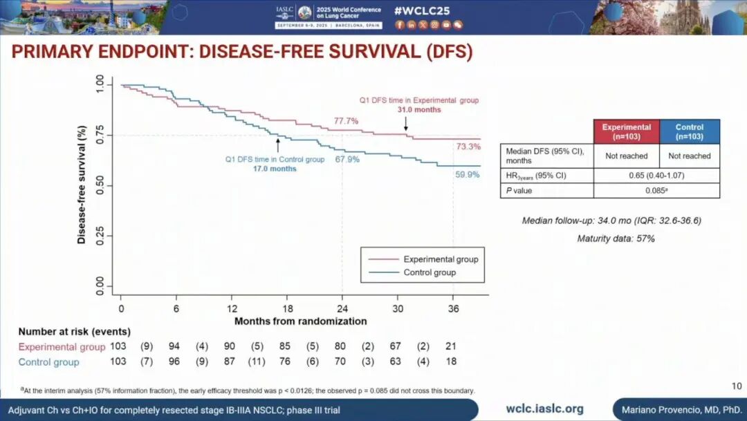 本次O药在早期可切除肺癌(IB-IIIA)R0切除后的术后辅助中,探索了一种新的辅助治疗模式,术后进行O药+化疗4周期辅助治疗后,后续O药6周期维持治疗,相比传统仅进行化疗4周期辅助化疗,主要终点DFS 虽尚未达到,但36个月的DFS率显著提升(73.3%:59.9%,HR=0.65,P=0.085),敏感性分析亦支持。