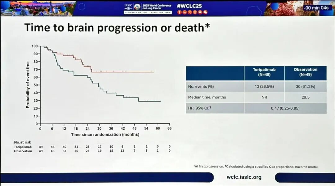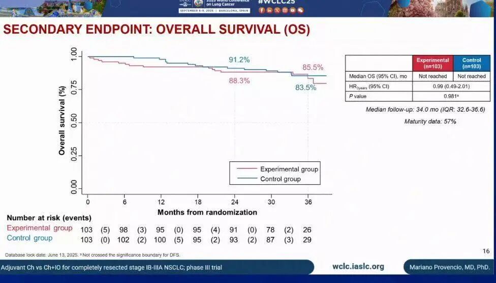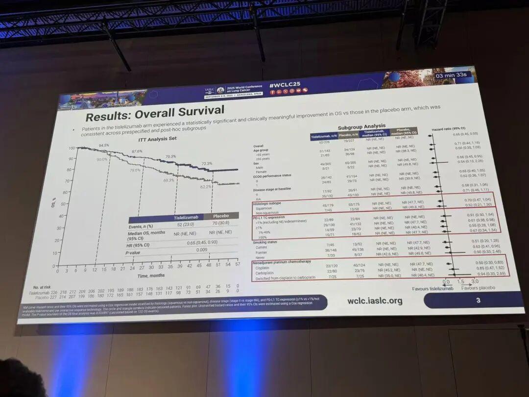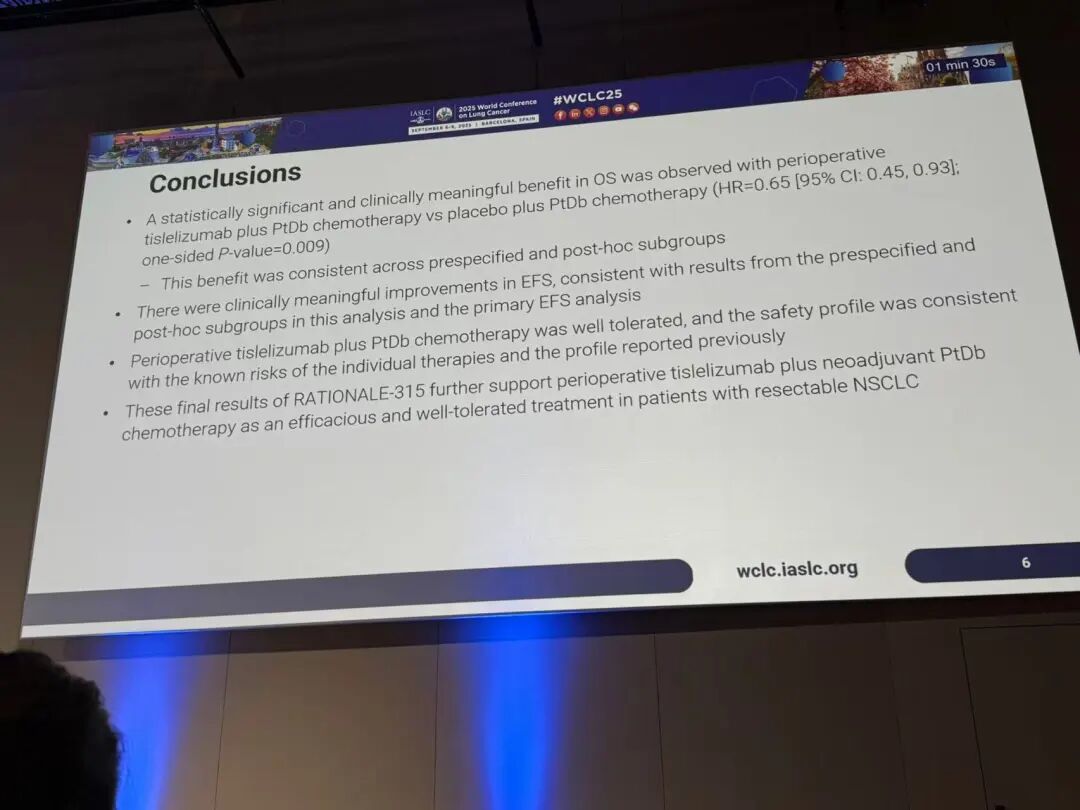 RATIONAL315研究是针对可切除II-IIIA期NSCLC患者术前进行3-4周期的替雷利珠单抗+含铂双联化疗,术后接受最多8个周期的替雷利珠单抗辅助治疗,对比仅化疗术前术后处理,中期分析结果显示EFS HR 0.56,此次OS结果显示 HR 0.65,具有统计学和临床意义,开拓了国内免疫围手术期治疗新纪元。