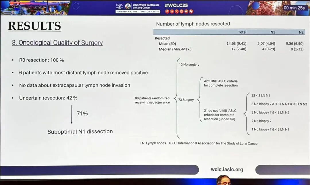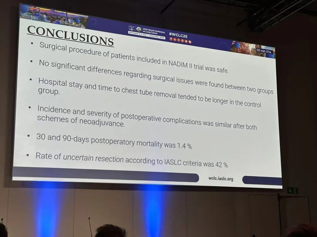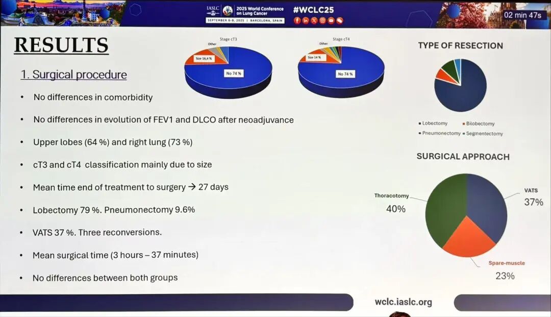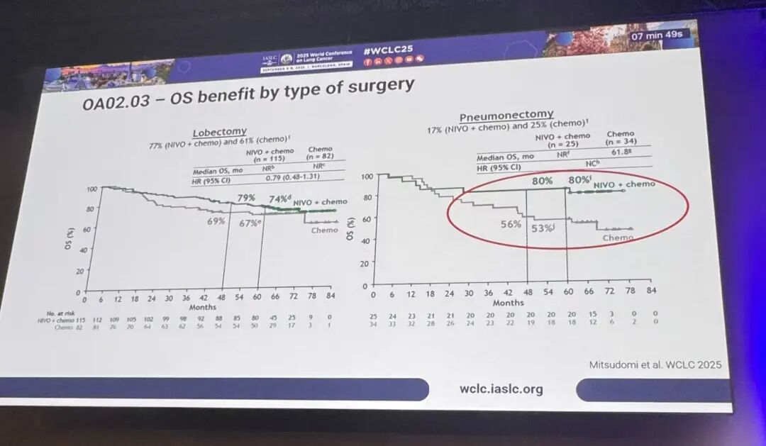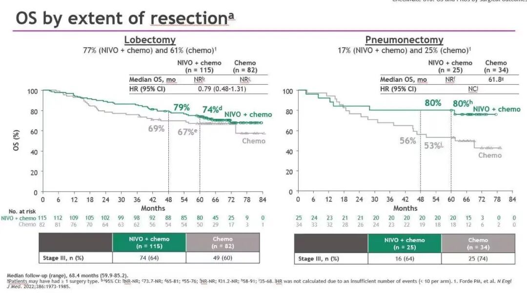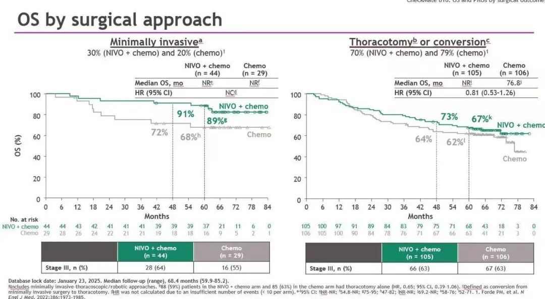 NADIM研究是在局部晚期可切除IIIA-IIIB期NSCLC患者开展的术前化免(O药+PC)新辅助治疗3周期,术后免疫辅助治疗6个月,对比仅进行术前化疗新辅助,获得了pCR率和MPR率的显著提升,此次对该研究的手术相关结果进行了总结汇报,显示出了该治疗模式在提升手术疗效的同时,安全性未见影响。