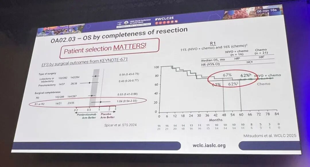 CheckMate -816研究开创了化免联合(O药+含铂化疗)作为新辅助治疗方案,用于可切除(肿瘤≥4厘米或淋巴结阳性)NSCLC的治疗模式,主要终点pCR(24%:4.6%)和EFS(54.8:20.9个月)均显著提升,年初报道了OS结果(HR 0.72),依然获得了统计学意义和临床意义的改善。此次大会对OS结果进行了亚组分析,获益趋势相似,但需注意的是,对于R1切除的患者未有提升,需谨慎选择,为未来其他研究的开展提供人群参考。