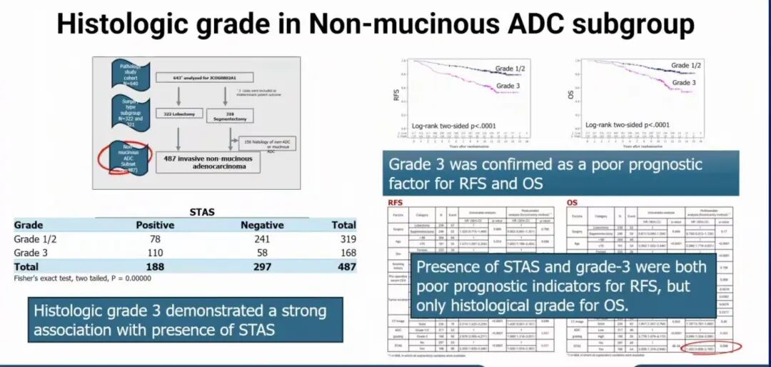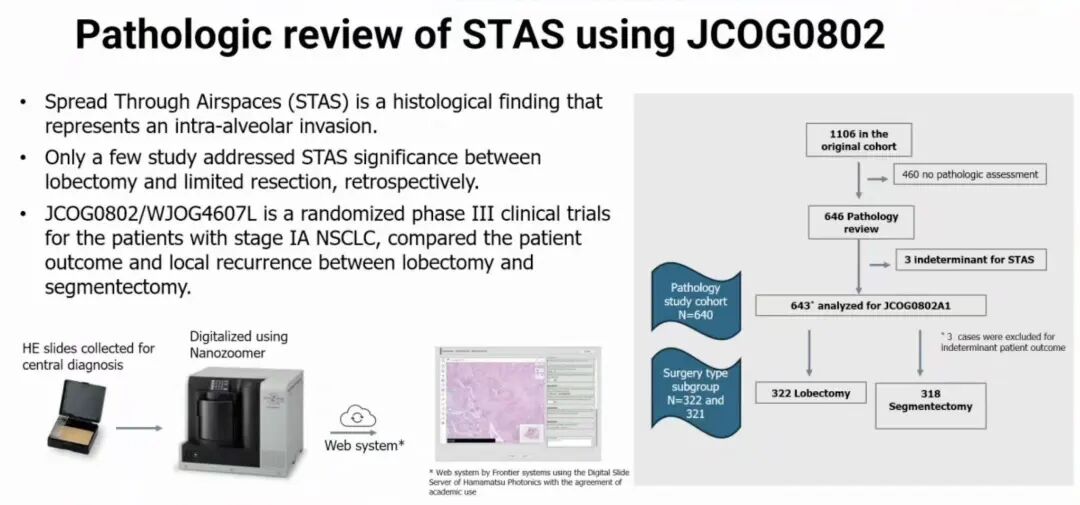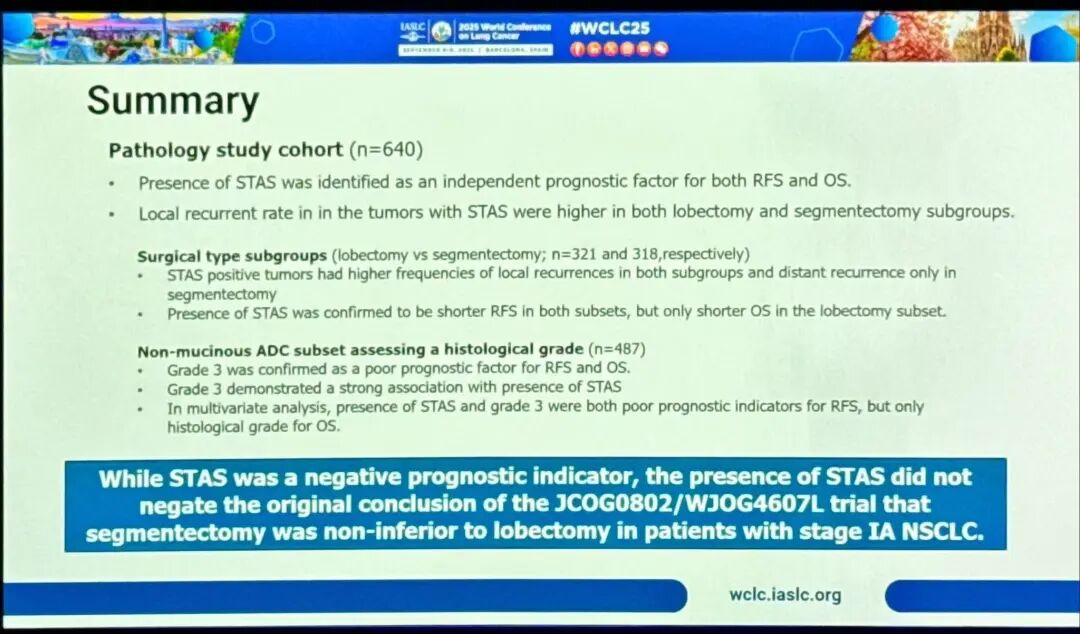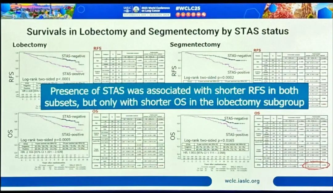 基于III期JCOG0802研究(IA NSCLC)分析显示,节段切除和肺叶切除具有相似的局部复发率,但是无论何种切除方式,具有气腔内播散(STAS)的患者局部复发率均较高,组织分级3级的STAS发生率更高。