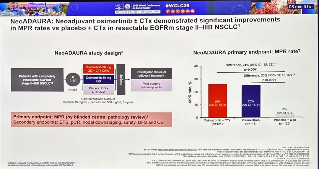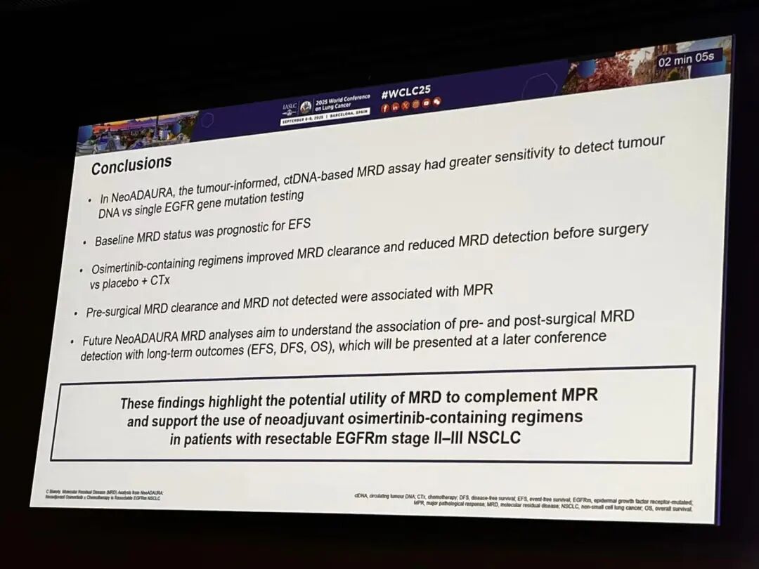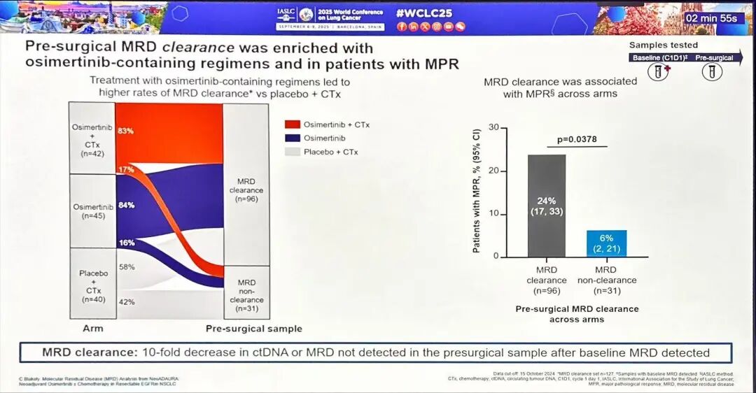 奥希替尼单药或奥希替尼联合化疗均能增加MRD的清除率,术前MRD的清除情况与MPR相关。