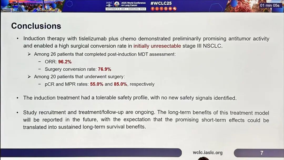 对于不可手术切除的III期NSCLC,采用替雷利珠单抗联合白紫+铂类诱导治疗2-4周期,手术转化率76.9%,pCR率55%。