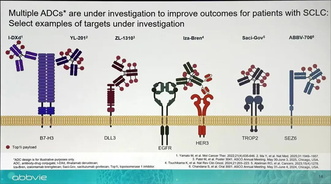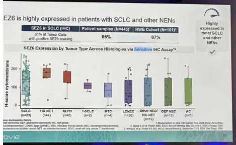 目前SCLC发现了众多可用靶点,包括B7H3、DLL3、HER3、TROP2、SEZ6,SEZ6 在神经内分泌肿瘤中高表达,其代表药物ABBV-706在本次大会公布了亮眼的疗效结果,在复发难治的SCLC患者中,ORR为56.1%-59.0%,PFS 5.6~6.8个月,在SCLC目前一众ADC药物中疗效显著。目前与免疫联合在SCLC的一线2/3期研究SEZanne计划开展,值得期待。
