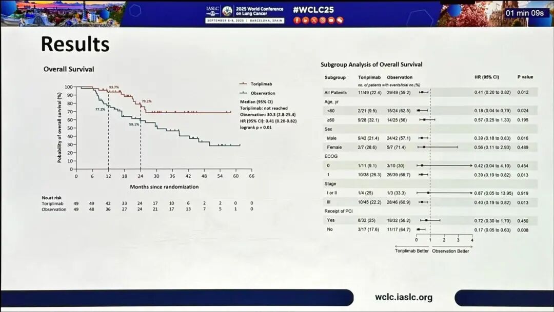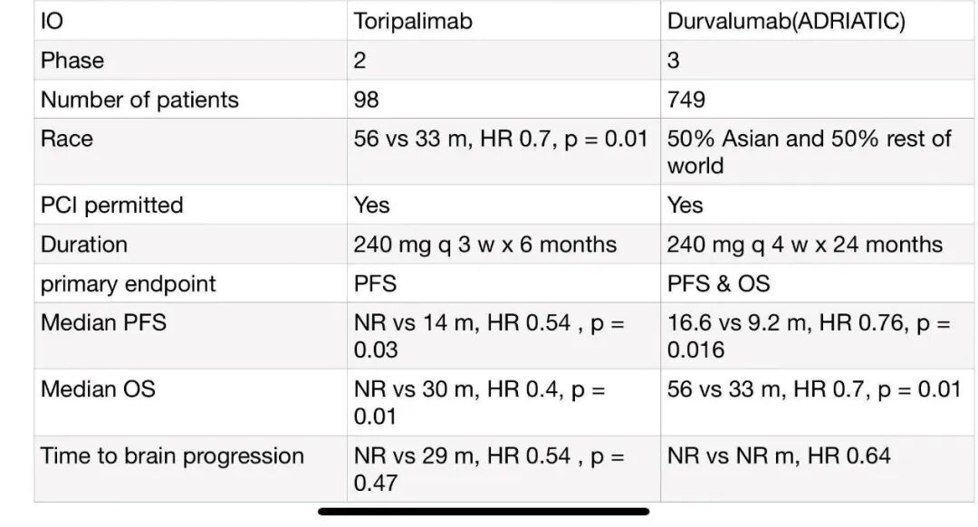 ADRIATIC研究(度伐利尤单抗)开创了免疫治疗作为局晚期SCLC同步放化疗后的巩固治疗模式,此次特瑞普利单抗也开展了相似的临床研究,结果显示,相比未进行巩固治疗,PFS和OS均有显著提升趋势(HR 0.54;0.41),相比ADRIATIC研究获益相近,再次印证了该治疗模式的地位。