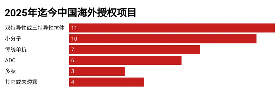 图2. 2025年迄今为止(2025年8月25日)中国向外授权医药开发项目模态分布图,数据来源:Biopharma Dive