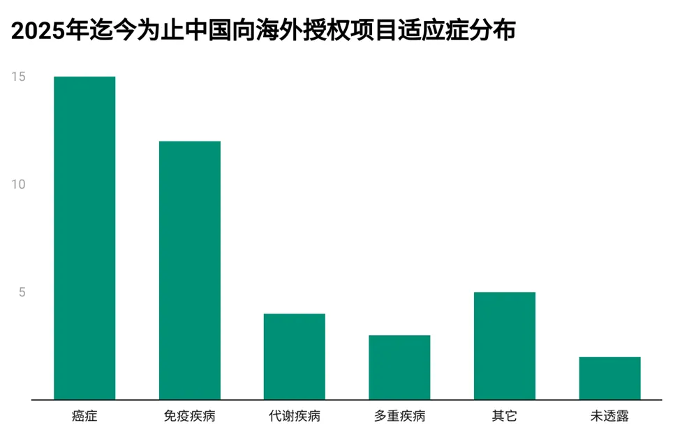 图3. 2025年迄今为止(2025年8月25日)中国向外授权医药开发项目适应症分布图,数据来源:Biopharma Dive