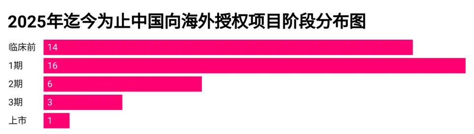图4. 2025年迄今为止(2025年8月25日)中国向外授权医药开发项目阶段分布图,数据来源:Biopharma Dive