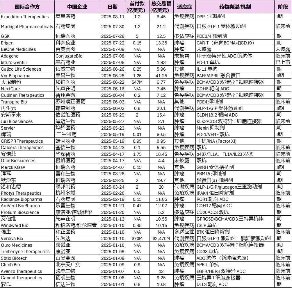 附表. 2025年(截至8月11日)主要中国生物医药企业跨境授权与合作