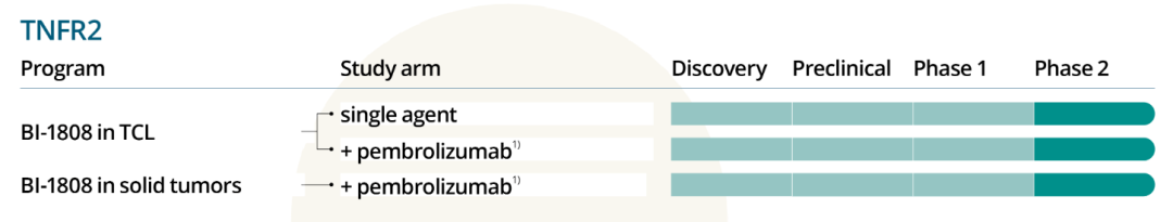 瑞典公司BioInvent International开发了一款靶向肿瘤坏死因子受体2(TNFR2)的抗体BI-1808,获得孤儿药称号的适应症为T细胞淋巴瘤。目前正在尝试单药和联用K药治疗T细胞淋巴瘤,在实体瘤中也有进行尝试。