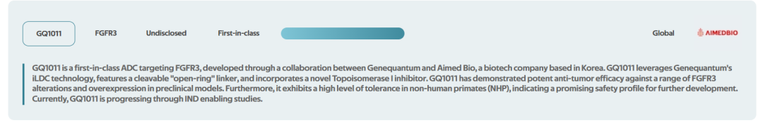 韩国公司AIMEDBIO和启德医药共同开发了FGFR3 ADC GQ1011/AMB302,适应症为恶性胶质瘤。其技术基于启德医药的新型TOPO1i抑制剂Topolx+AIMEDBIO的智能连续偶联技术iLDC。
