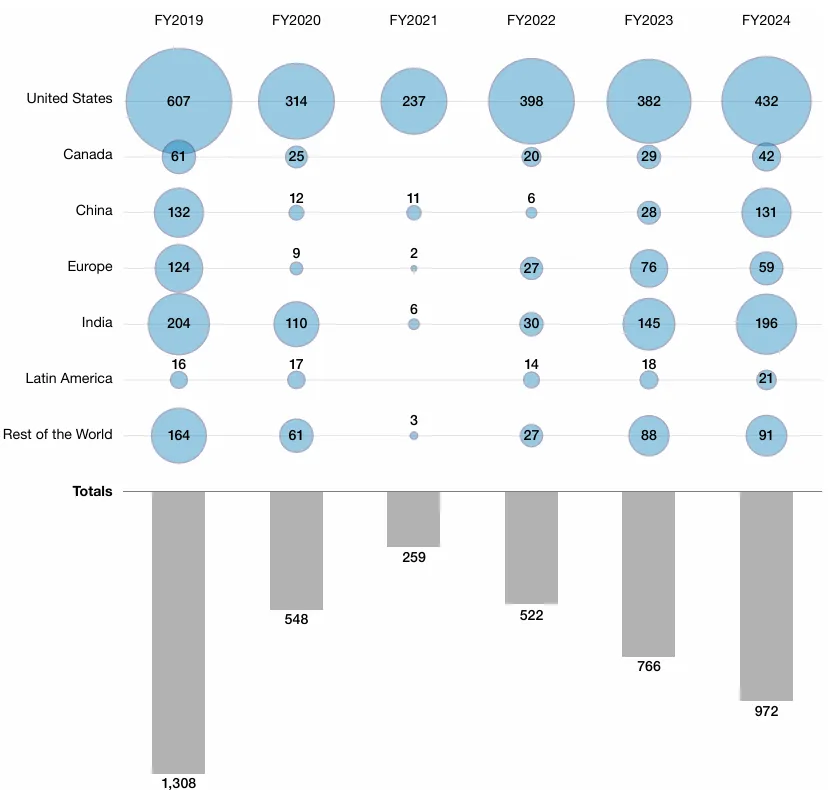 图1 2019财年至2024财年FDA按国家和地区分类的药品质量保证检查情况的项目