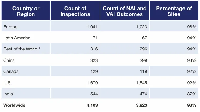表1 截至2024财年,按国家/地区划分的、最新检查结果为NAI(无整改要求)或VAI(建议自愿整改)的场地比例