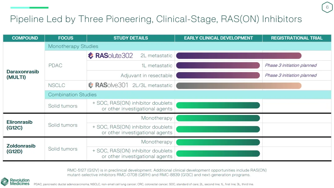 Daraxonrasib成药性经早期临床数据支撑下,RVMD计划推动四个适应症同步进行临床三期验证,除了2L/3L转移性非小细胞肺癌已经进入三期(RASolve301研究)外,在PDAC适应症上,公司的2L转移性PDAC已经进入三期临床(RASolve302研究),并且治疗可切除PDAC的辅助治疗、1L转移性PDAC适应症的三期临床启动也在路上,基本上做到了适应症全域覆盖。