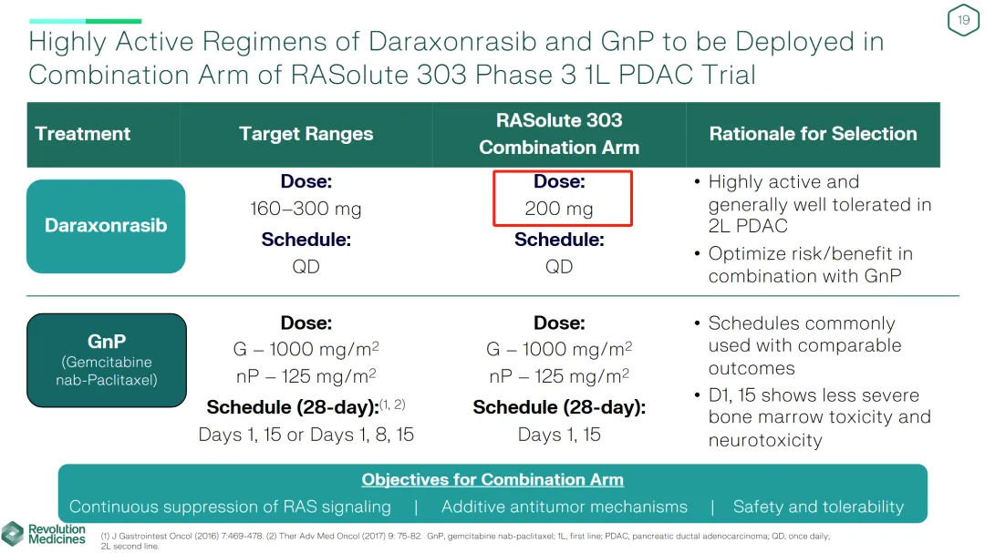 在治疗1L转移性PDAC患者的研究中,无论是一期临床还是未来要进行的三期临床(RASolve303研究),联合GnP组都设计为减量1/3(从单药最高剂量的300mg减到目前200mg),或许是为了更好的平衡疗效和安全性。