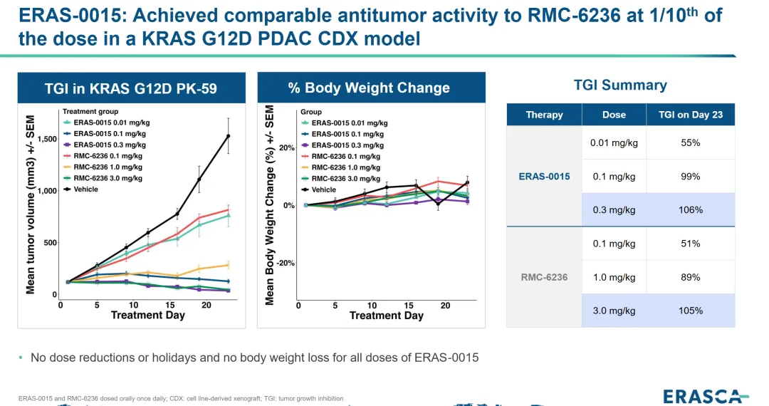 在KRAS G12D PDAC CDX模型和不敏感的KRAS G12V NSCLC CDX模型中,ERAS-0015仅用1/10剂量便实现了与Daraxonrasib相当的抗肿瘤活性。