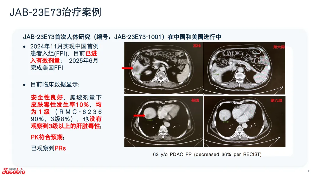 在9月初的业绩会交流上,公司展示了两例PDAC患者的基线与第六周的肿瘤对比图,均展示出部分缓解(PR)的疗效。同时在爬坡剂量下,观察到皮肤毒性(发生率为10%、均为1级),尚未观察到大于3级的肝毒性,初步安全性良好。