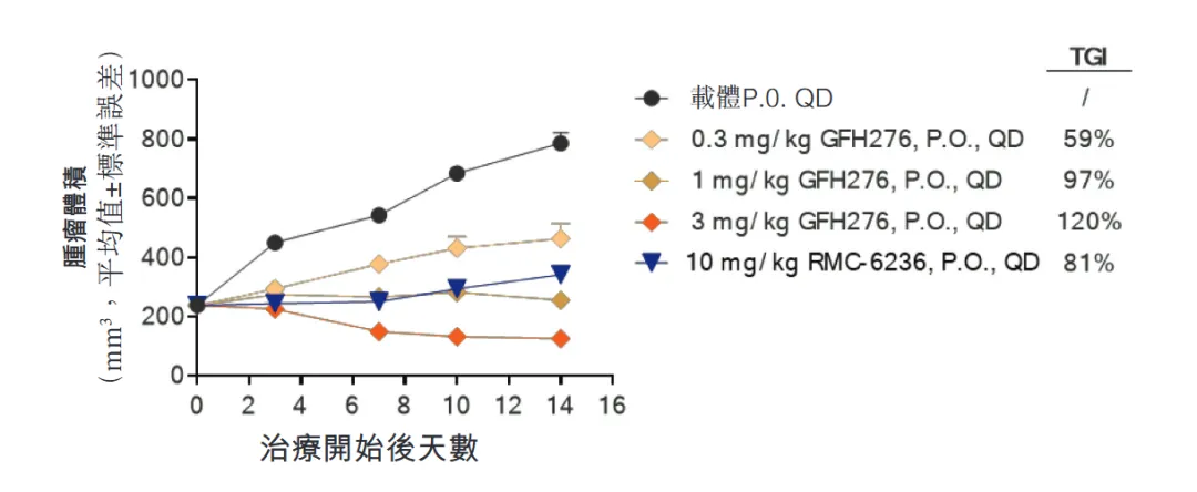 正在港交所招股的劲方医药有一款pan-RAS抑制剂GFH276,其路线与RVMD的Daraxonrasib类似,通过与RAS(ON)蛋白形成三元复合物阻断下游信号通路,同样其临床前数据显示:在动物体内仅需Daraxonrasib的1/10剂量即可达到同等的抗肿瘤效果。目前,GFH276已在国内获批I/II期临床,用于治疗RAS突变阳性或KRAS扩增的晚期实体瘤患者。