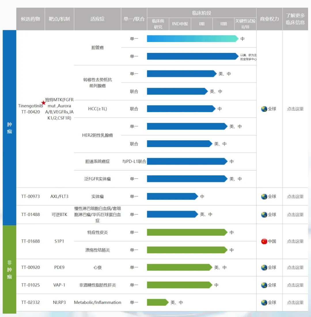 其核心产品是恩戈替尼(Tinengotinib, TT-00420),这是一种独特的多靶点激酶抑制剂,主要靶向三个关键通路:FGFR/VEGFR、JAK及Aurora。该产品正进行两项关键性/注册临床试验,用于治疗在过往接受FGFR抑制剂治疗后疾病发生进展的胆管癌。
