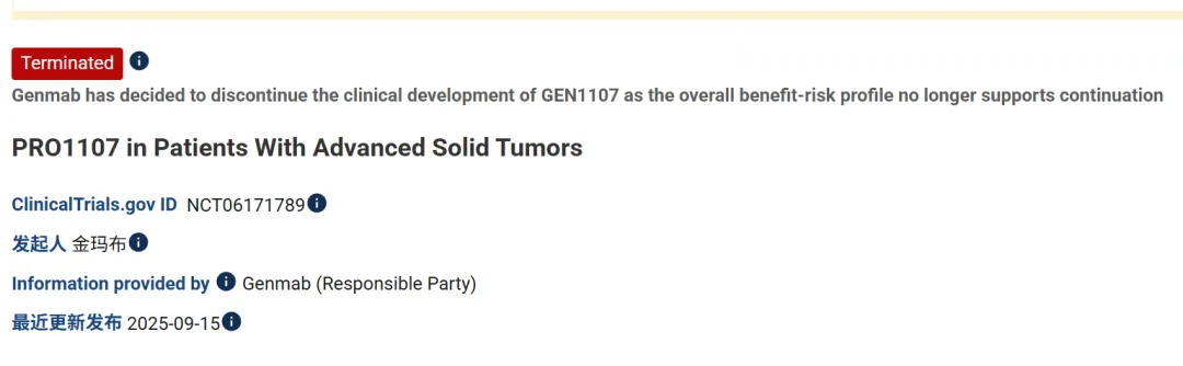 根据clinicaltrials.gov显示,Genmab已决定停止GEN1107(以前被称为PRO1107)的临床开发,因为整体收益风险情况不再支持其继续进行。