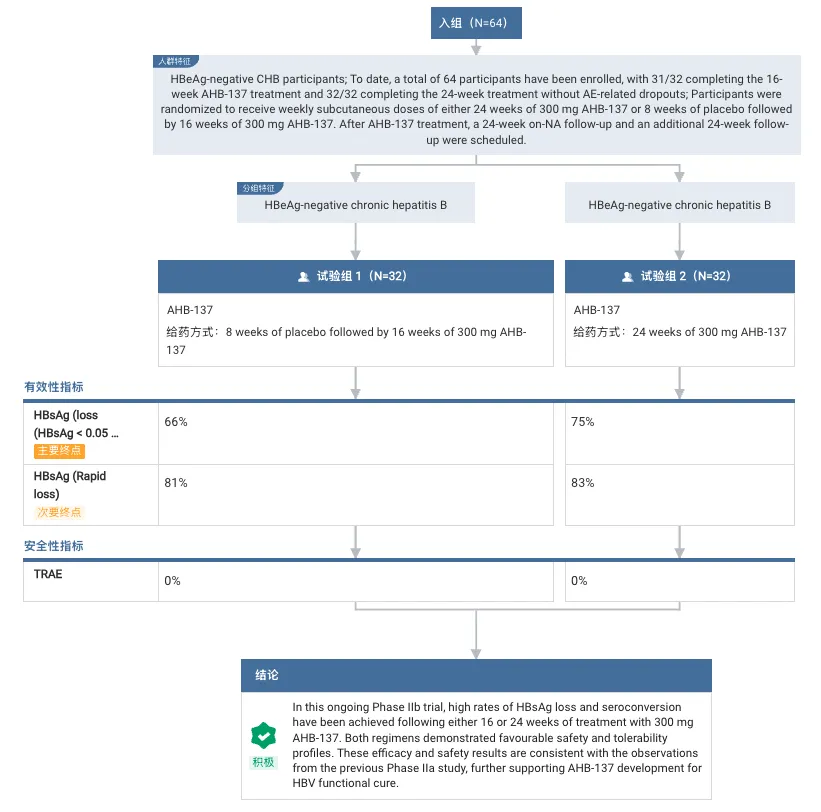 这项研究一共纳入了 64 名受试者,随机分组接受AHB-137 300 mg 24 周治疗和 16 周治疗。结果显示,在24周治疗组中,75% 受试者达到了主要终点,乙型肝炎表面抗原(HBsAg)水平低于定量下限(<0.05 IU/mL)以及乙型肝炎病毒(HBV)DNA 水平低于定量下限(<10 IU/mL)。在 16 周治疗组中,66% 受试者达到了这一主要终点。