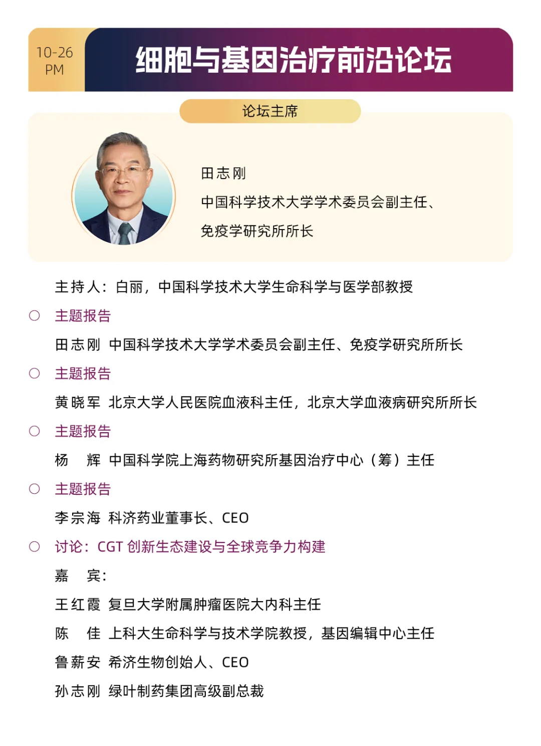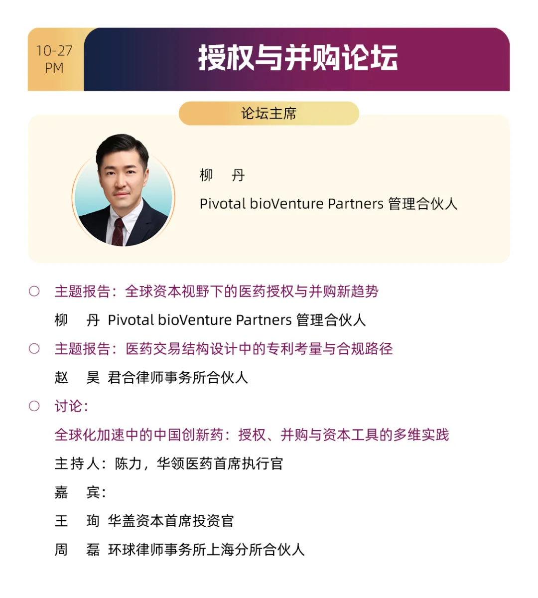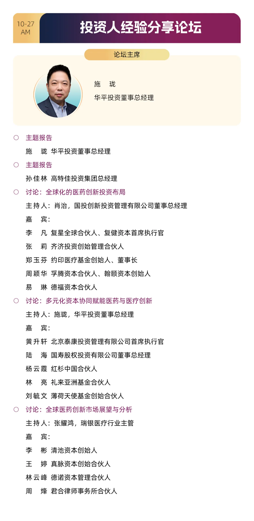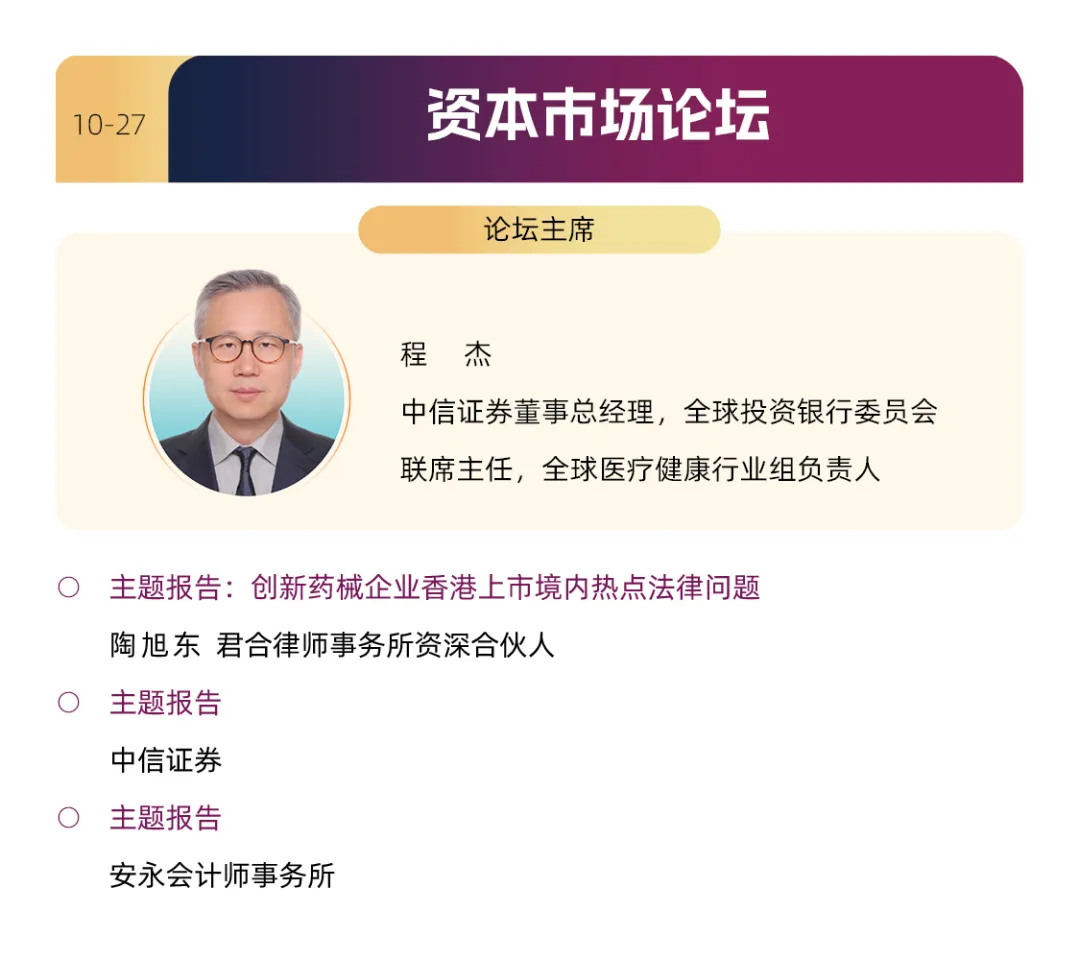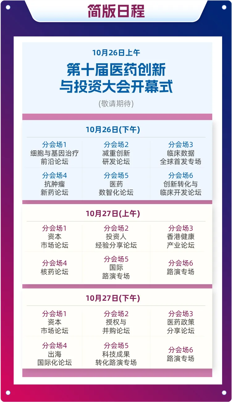 本次大会涵盖多个专题论坛,覆盖创新药研发、临床研究、细胞与基因治疗、投资并购、资本市场和商保政策等多个热点领域,特邀权威专家与知名投资人,分享行业洞见、解读政策趋势、探讨合作机遇。
