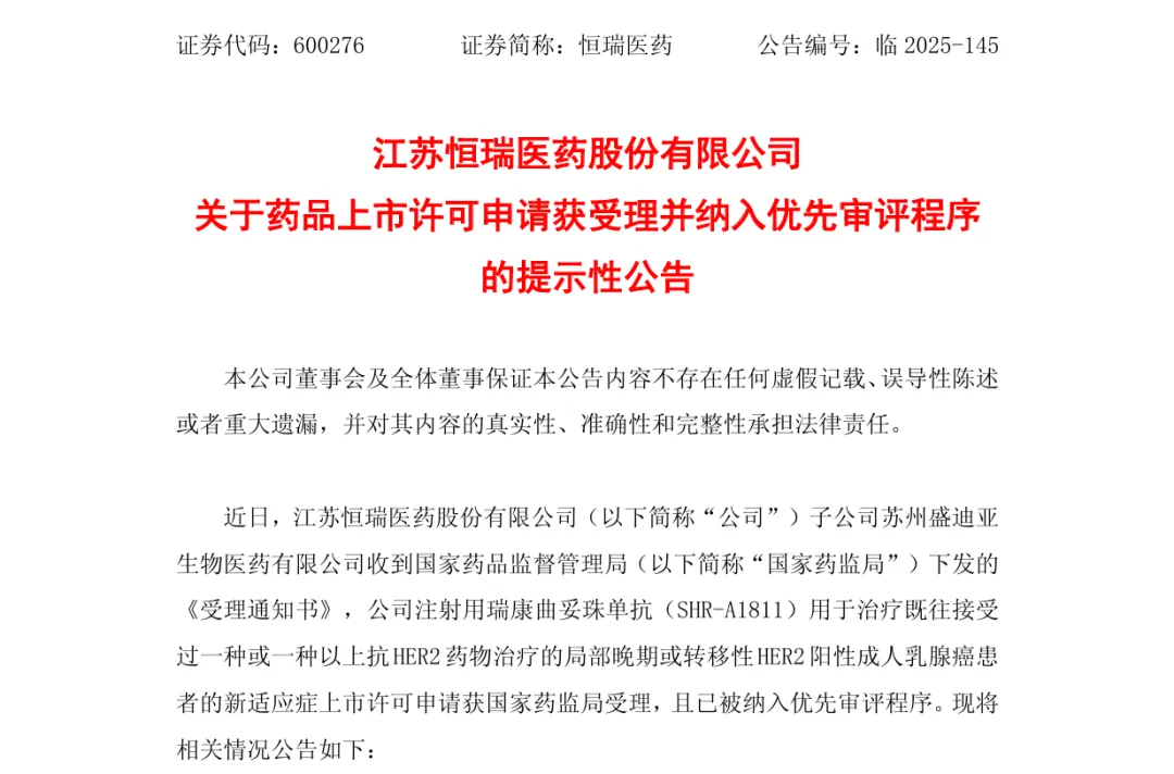 9月18日,恒瑞医药公告称,其子公司苏州盛迪亚生物医药收到国家药监局《受理通知书》,该公司的注射用瑞康曲妥珠单抗(SHR-A1811)上市许可申请已获受理,并被纳入优先审评程序。该药物此次申报的适应症为:针对既往接受过一种或多种抗HER2药物治疗的局部晚期或转移性HER2阳性成人乳腺癌患者。