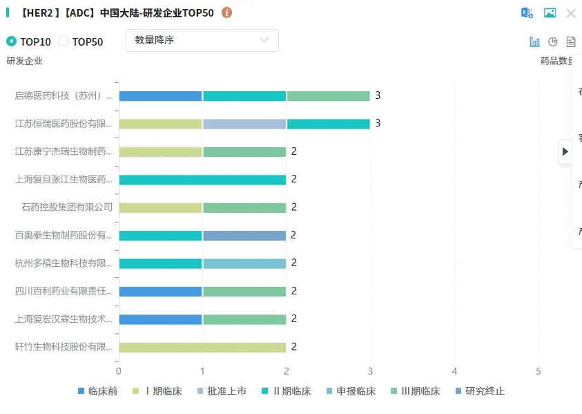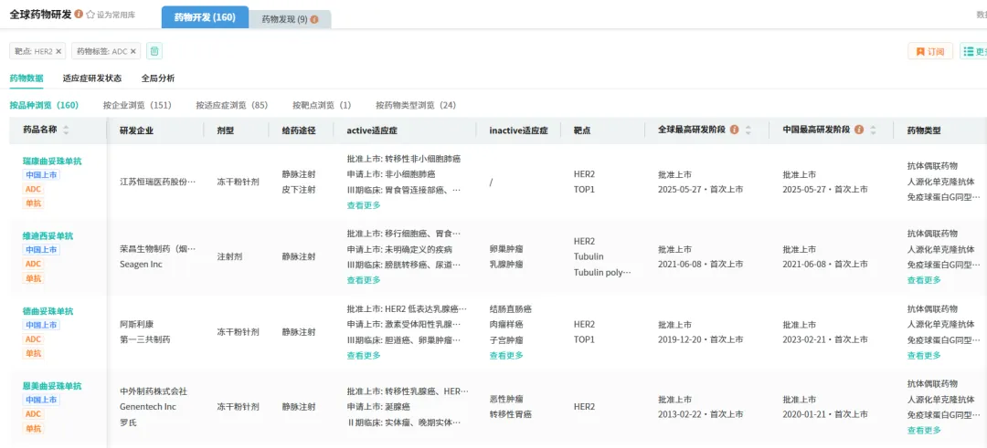 当下,国内HER2 ADC赛道竞争已进入白热化阶段,瑞康曲妥珠单抗(SHR-A1811)面临全球“药王”级产品挑战。目前,与SHR-A1811同处HER2靶向ADC领域新药管线超150个,4款已上市,除瑞康曲妥珠单抗外,还有阿斯利康的德曲妥珠单抗、罗氏的恩美曲妥珠单抗、荣昌生物的维迪西妥单抗。