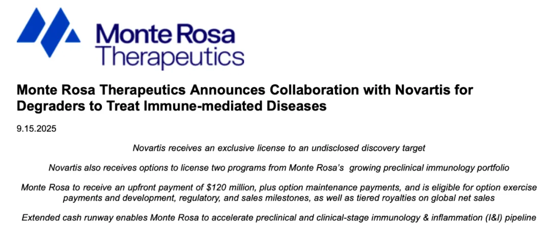 2025年9月15日,临床阶段生物技术公司Monte Rosa Therapeutics(纳斯达克股票代码:GLUE)宣布与诺华达成一项新合作,双方将携手开发用于治疗免疫介导疾病的新型降解剂。值得关注的是,这是继2024年10月双方就Monte Rosa的VAV1降解剂(包括MRT-6160)达成全球独家许可协议后,再次展开合作。