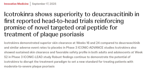 结果显示,Icotrokinra 优于氘可来昔替尼,进一步证明了新型靶向口服多肽治疗斑块状银屑病的前景。