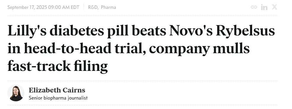 9月17日,礼来公布了ACHIEVE-3研究的积极顶线结果,结果显示其研发中的每日一次口服GLP-1受体激动剂orforglipron在一项为期52周的头对头试验中,对比口服司美格鲁肽在2型糖尿病成人患者中展现出更优效果。公司预计将于2026年申请批准Orforglipron用于治疗2型糖尿病。